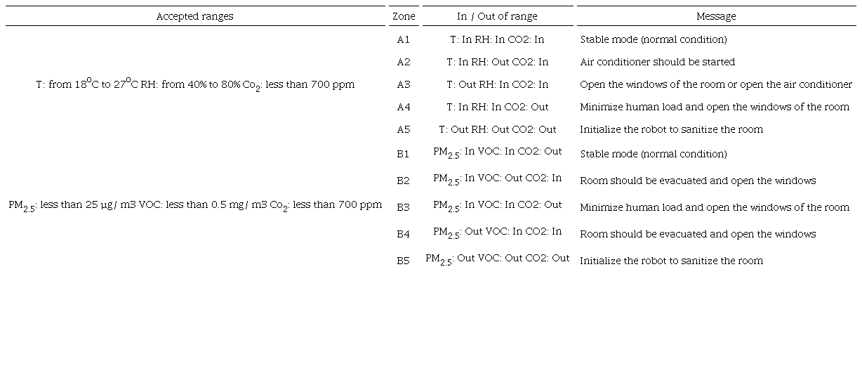 Experimental validation is done to test the ability of the robot to measure the air quality parameters and to take appropriate action according to the classified zone. The practical experiment is repeated several times in Alexandria higher institute of Engineering and Technology (AIET) in the presence of the students and staff members. In each experiment, a message is displayed to the user on the application with the appropriate procedure to be performed on the basis of the sensors’ readings, which represent a point in a predefined zone, as shown in Figure 8.