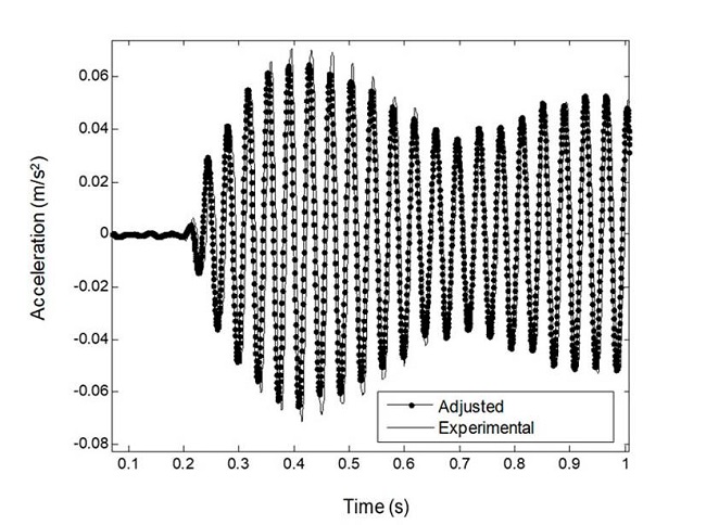 The 153,964.41 N axial force was identified with a 4.47% maximum error and a 1% minimum error (Tables 3 to 5). It is worth mentioning that the minimum error was an overestimation of the force, therefore this result should not be considered adequate from the point of view of structural safety. Nevertheless, the results are encouraging and show the potential effectiveness of the method. Fig 4 and Fig 5 show that the calculated responses after the identification process (dotted line) correspond adequately with the experimental results (continuous line).
