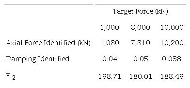 Prior to identification, the initial finite element model was adjusted to minimize the initial error. Careful definition was exercised for the physical and geometric parameters, as well as for the finite element mesh size, and the following values were used: E = 24.5 x 10^9 N/m2, ρ = 2,400 kg/m3, and a 20- element mesh. The stiffness matrix was defined according to Eq. 5 and the mass was modeled with consistent matrices (derived from shape functions). The axial force was introduced by using the geometric stiffness matrix (Eq. 6).