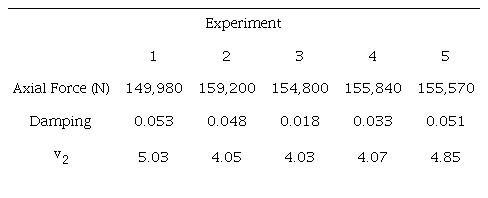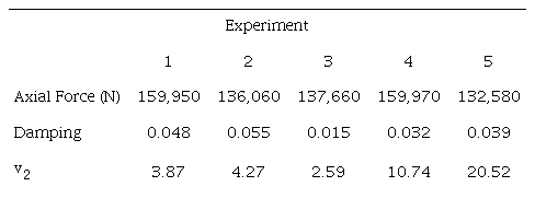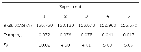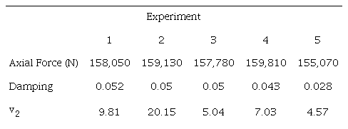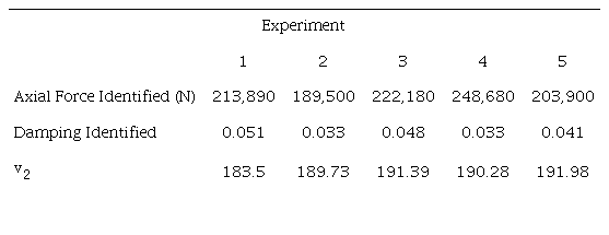Identification was performed by using the same scheme as used for the numerical simulations, i.e., seeking minimizing values for the generic parameter, the axial force, and the equivalent viscous damping ratio, and specifying domain constraints. The search was conducted over the range of 80,000-180,000 N for the axial force, 2-192 for , and 0.01-0.05 for the damping ratio. The excitation used corresponded to the first two seconds of the sweeps used for identification. Three different initial temperature levels were evaluated to avoid solutions blocked at high temperatures or low temperatures. How was mention below it was assumed that the axial force had a loss of 20%, which is a reasonable approximation of the initial losses in a pre-stressed beam. Additionally, the generic parameter was taken to be a constant value of 48, so that it may be left fixed and damping can be included in the identification problem without increasing the number of parameters. Tables 3 to 5 show the results of five identification runs for the 153,964.41 N force at temperatures of 5,000, 50,000, and 100,000. According to the results, the temperature at 50,000 presents lower dispersion and, hence, its results are considered most suitable to make decisions and draw conclusions.