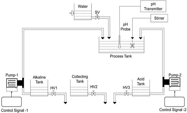 The solution whose pH is to be monitored is fed into the water tank at the top. This solution from the water tank is supplied to the process tank through a solenoid valve (SV). Depending on the initial pH value of the solution and based on whether the solution is to be neutralized or made acidic/alkaline, alkaline (0.1 N Sodium Hydroxide solution) and acidic solution (0.1 N Hydrochloric acid solution) are added to the process tank through Pump 1 & 2. A stirrer mixes the contents of the process tank before its pH is measured. The pH probe and transmitter measure the pH value of the solution in the process tank and convert it into (0-5) V range. The measured pH value is the controller input, and the controller varies the strokes per minute of the pumps, changing the inflow of acidic and alkaline solution to the process tank based on the desired pH value to be maintained in the process tank. Once the pH value is controlled or retained at the desired value, the contents of the process tank are emptied into the collecting container. Three hand valves, HV1, HV2, and HV3, are provided to drain the contents of the alkaline tank, collecting tank, and acid tank, respectively. Figure 1 portrays the schematic diagram of the pH neutralization setup.