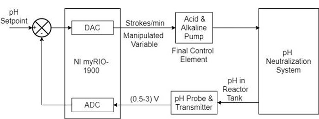 The output of the signal conditioning circuit was fed as the input in any of the referential single-ended or differential-ended analog input channels of the RIO. The corresponding analog output from RIO was converted to 4-20 mA and fed to the pump to manipulate the speed of the pump and thereby the flow rate of the alkaline or acid solution to the mixing tank in the system. Then the control loop was developed in LabVIEW software. The controller configuration and gains were varied in the Front Panel and Block Diagram (Dixit & Jain, 2016). After changing the controller gains, the corresponding results were recorded.