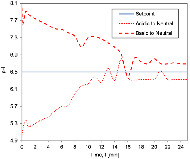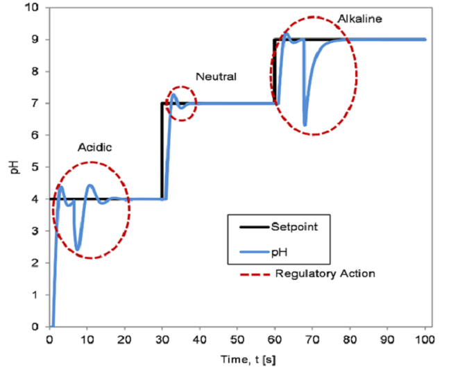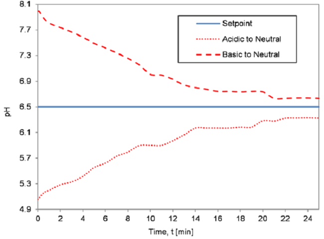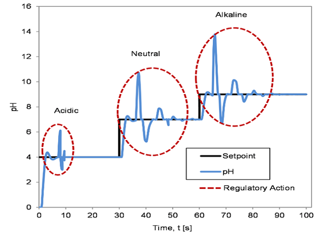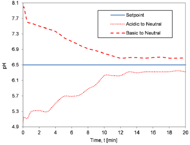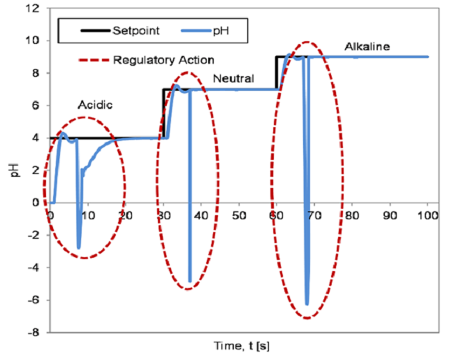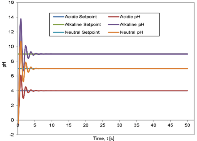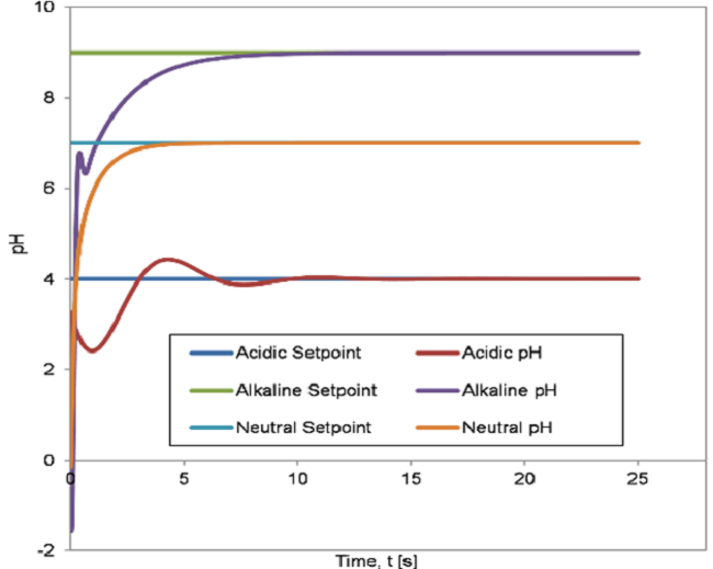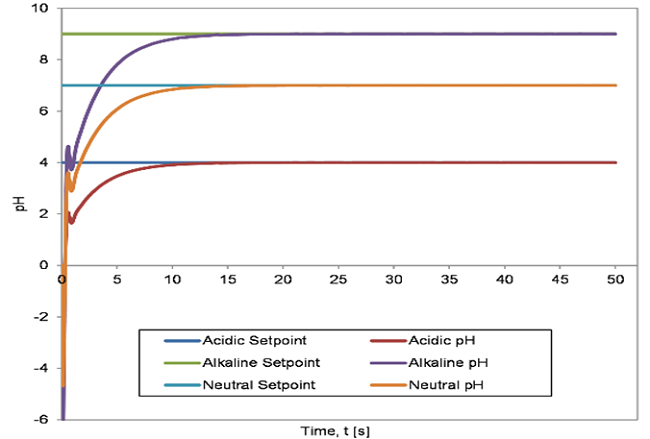 Variable setpoints were provided to assess the controller’s ability to track setpoints. A setpoint of 4 was chosen for acidic control, 7 pH was chosen for neutralization, and a pH value of 9 was chosen for alkaline control.