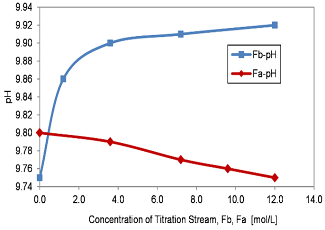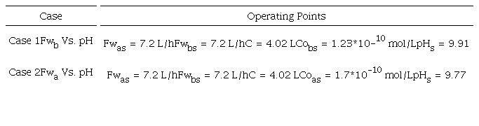 Depending on the required pH value from the process, either the acid solution or alkaline solution was added to the process tank. For instance, if the process solution is acidic, an alkaline solution was added to neutralize it and vice versa. State-space models for both the cases, stated in Eqs. 4 to 8, were derived from Eqs. 1 to 3. Then the various operating points obtained from the open-loop I/O characteristics (Table 2) were substituted to compute the state-space model and the corresponding transfer function, as shown in Table 3. Open-loop I/O characteristics from the process (Figure 2) were noted by varying one manipulated variable and maintaining the other variable constant. Initially, the inflow rate of the acidic solution was maintained at a constant value (Fwa = 7.2 L/h). Then, for various inflow rates of the alkaline solution (Fwb), the pH value of the solution in the process tank was recorded. Similarly, Fwb was maintained constant, and Fwa was varied, and the corresponding pH value was recorded.