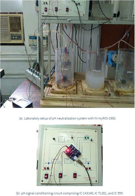 In this system, the pH probe and transmitter were calibrated before use, and the output of the pH transmitter ranging from -420 mV to 420 mV was scaled to 0.5 V to 3 V using a signal conditioning circuit comprising IC CA3140, IC TL081, and IC 555 timer, as shown in Figure 9 (b). Then, the output of the signal conditioning circuit was fed as the input to the RIO, and the output of the RIO was used to manipulate the speed of the pump and thereby the flow rate of the alkaline or acid solution to the mixing tank in the system to maintain the pH value, as explained in Figure 10.