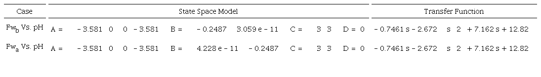 From Table 3, it can be seen that, mathematically, the state space and transfer function model of both the cases are similar. Therefore, either case can represent the pH neutralization system in simulation.
