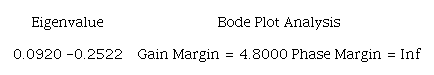 Eigenvalues and frequency response of the system were used to analyze the system’s stability. The system was completely stable since all its eigenvalues were negative, and the phase margin and the gain margin were positive values. Furthermore, the phase margin was higher than the gain margin, as stated in Table 4.