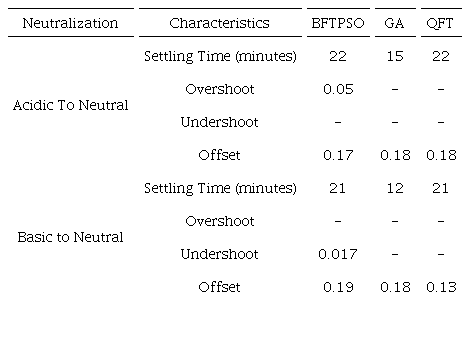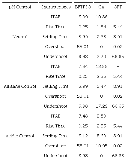 The behavior of the controllers for alkaline and acidic pH control was similar, as with neutralization. The BFTPSO controller generated the fastest control action with large overshoots and undershoots. On the other hand, the QFT controller generated the slowest control action with no overshoots and large undershoots in the response. Meanwhile, the GA controller generated a response with significant undershoots in alkaline control and significant overshoots in acidic control. Nonetheless, the GA controller was preferred over the others, as it produced a quick control action with the fastest settling time and lesser overshoots/undershoots.