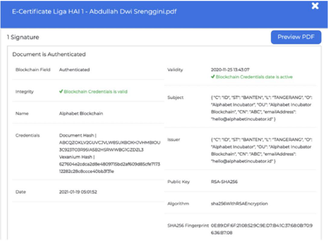 Figure 8. shows the Blockchain Field section that this certificate has been authenticated, with a document hash included. There are two types of document hashes made in this implementation: a unique hash from ABC with the letter ABC code at the beginning of the hash and a unique hash from Vexanium. Vexanium is a public blockchain that works asynchronously to link each certificate to the blockchain.