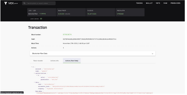 Figure 9. displays certificates linking the blockchain system. Due to its transparent property, every certificate embedded with a blockchain hash can be authenticated on the ABC official site and subsequently auto verified on the public blockchain https://explorer.vexanium.com/ by comparing the corresponding Vexanium hash listed in details certificate information.