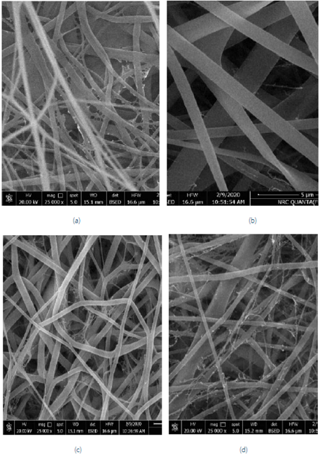 Figure 1(a-d) shows the SEM micrographs of nanofibrous mats (NFM) obtained by electro-spinning PA6, PA6/K, PA6/S, and PA6/K-S composites, respectively. It easy to notice in this figure that the nanofibers obtained from each solution are haphazardly disseminated on the mats, creating a non-woven web. As declared in Table 1, the diameter of the obtained fibres lies within the nanorange which provides huge surface area of the prepared mats and consequently one would expect a high capacity of capture of metal ions and dyes from effluents.