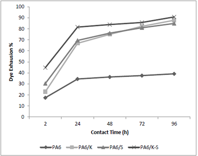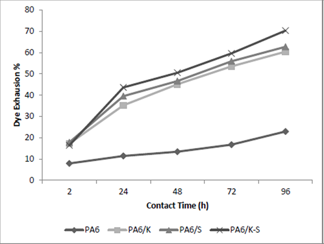 Figures 2 and 3 show that the sorption capacity of the regenerated PA6 NFM towards the used anionic dye is higher than the used cationic dye. This can be rationalized in terms of the protonated nitrogen-containing functional groups along the polyamide macromolecules. Results of Table III revealed also that the affinity of PA6/K, PA6/S, and PA6/K-S NFM towards the said dyes is higher than the corresponding PA6 samples, presumably, because of the synergetic effect of the polar functional groups in keratin and sericin in addition to PA6. In all cases, the máximum dye sorption is attained after 96 hours for basic dye and 72 hours for acid dye.