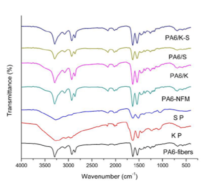 Figure 4 shows the FTIR chart of PA6 fiber, PA6 regenerated mat, keratin and sericin powder, PA6/K, PA6/S, and PA6/K-S NFM.
