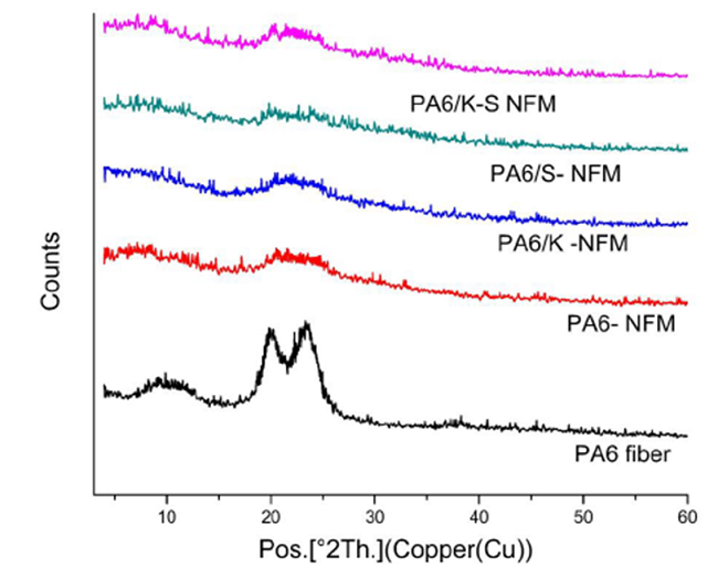Figure 6 shows that there are two peaks appeared in the XRD pattern of PA6/K sample at 2θ (21.8° and 6.8°), PA6/S sample (at 2θ 24.06° and 9.1°), and PA6/K-S sample (at 2θ 20.3° and 6.7°). The peaks at 2θ 21.8°, 24.06°, and 20.3° belong to PA6; whereas those at 2θ 6.8°, 9.1°, and 6.7° correspond to keratin, sericin and their blend, respectively. The discrepancy in the 2θ value of keratin and sericin in the PA6/K and PA6/S NFM relative to the corresponding native ones assures the binding of keratin and sericin into PA6 polymeric chains, also the shift in the d-spacing emphasizes this hypothesis.
