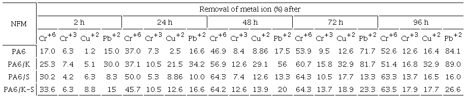Similar trends were observed upon using PA6/K, PA6/S, and PA6/K-S NFM for removal of the same cations from their aqueous solutions (Cr+6>Pb+2> Cr+3>Cu+2).