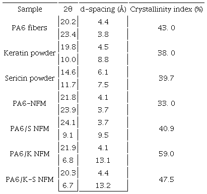 As displayed in Table 3, the crystallinity of PA6/K, PA6/S, and PA6/K-S NFM is more than that of the analogous nativepolymers. This may be attributed to the formation of physical bonds; viz. hydrogen bonds, between the polar groups along PA6, keratin, and sericin macromolecules which decreases the freedom of the polymer chains and results in creations of more crystalline areas (El-Newashy et al., 2019).
