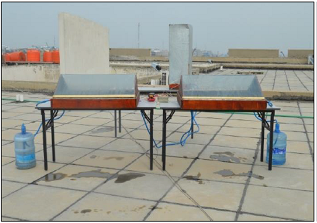 For the purpose of performance comparison, two types of single-effect single-slope solar stills were designed, built and investigated under the circumstances of Baghdad (Figure 1). The first solar still is a conventional one, whereas the second is integrated with perforated inclined fins at the basin plate.