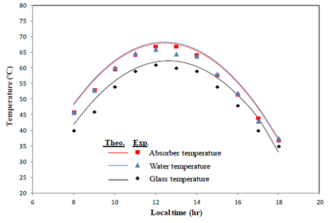 The increase in the water temperature can be attributed to improvement made to the thermal performance of the finned basin solar still. Also, the water temperature is significantly affected by coupling perforated inclined fins with the solar still absorber. Moreover, the still with perforated inclined fin absorbers provides an absorber temperature larger than that of the conventional still. This result was expected because the use of inclined fins increases the surface area of the absorber plate. Thus, the rate of heat absorbed by the finned absorber is increased owing to the increase in the surface exchange. Hence, the absorber’s temperature is increased. Figure 10 depicts the measured temperatures compared with the predictions temperatures using the mathematical model. It can be observed that both experimental and mathematical results show the same trend in temperature rise and decrease with respect to time. The average difference between the mathematical and experimental results was found to be 9% for water temperature and 12% for glass temperature.