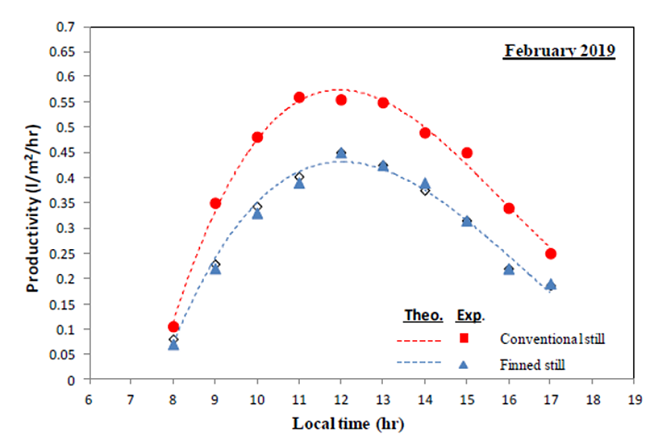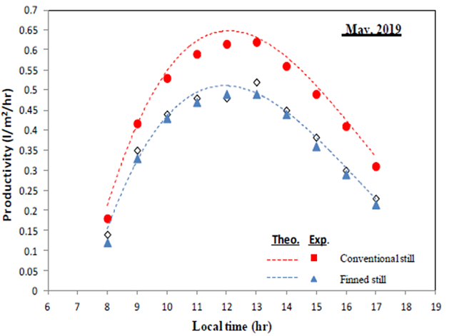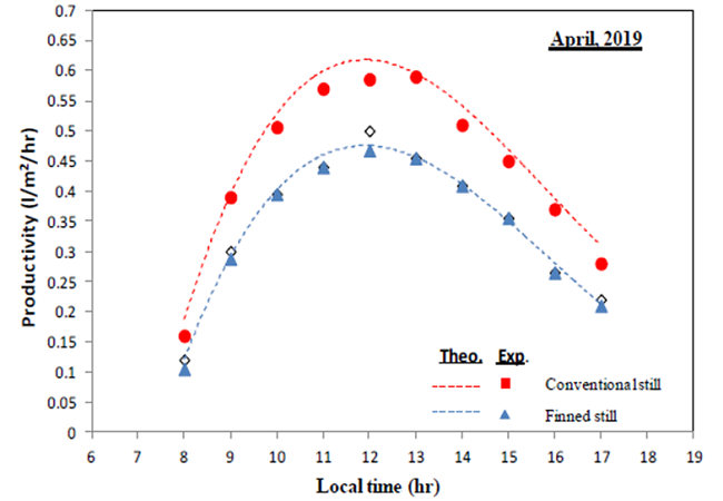 The empirical and mathematical hourly productivity of the two solar stills (for all the test months) is presented in Figures 11, 12, 13 and 14. The average hourly productivity yields as a function of solar intensity. Productivity is low during hours of low radiation (in the morning hours) and reaches the maximum during hours of high radiation, i.e. afternoon hours. The greatest hourly productivity is found to be achieved at 1 p.m. for the two stills. This result is due to the solar radiation that reaches its peak value between 1-2 p.m. at the chosen location.