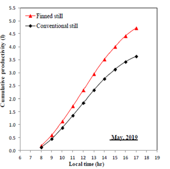 It can be observed that the yield during the month of May is higher to that of other months (February, April and March), as the different between glass temperature and basin water temperature that is highest during this month. Furthermore, the productivity of the solar still with inclined fins during daytime is higher than that of the conventional solar still. The average hourly yield of the conventional and finned solar stills is 380 and 439 mL/m2h, respectively, on May.