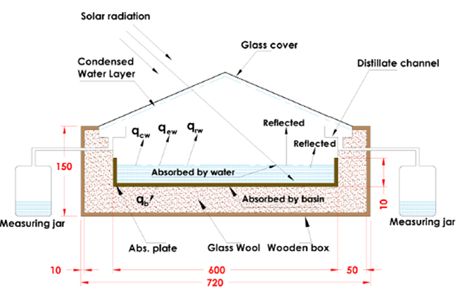 Figure 2 displays the schemas for the various heat transfer modes in the double-slope solar still. Such types are convection, heat, and evaporation. The conventional still and finned mathematical models are based on the energy balances of the glass, basin water and basin. The following premises are considered in the determination of equations for the energy balance.