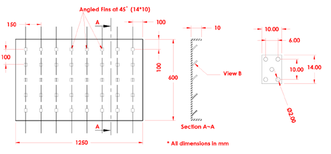 Solar stills with perforated inclined fins are shown in Figure 3. Finned and conventional stills have similar dimensions and external designs. The only difference lies in the absorber plates, where they are perforated finned and not flat. The finned absorber plate is made of galvanised iron and manufactured by a computer numerical control milling machine. The breadth, thickness and length of the fins used in this study were 14, 10 and 2 mm, respectively. The pitches between two neighbouring fins were taken as 100 and 150 mm in the longitudinal and transverse directions, respectively. The dimensions and other details of the finned basin are shown in Figure 4.