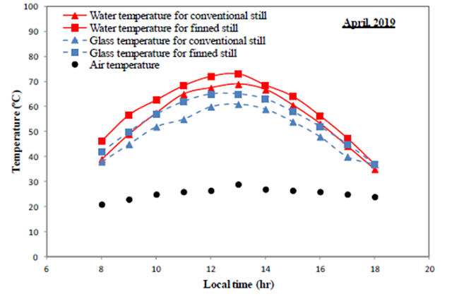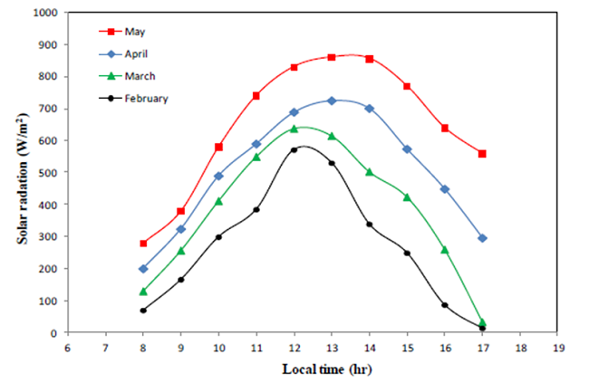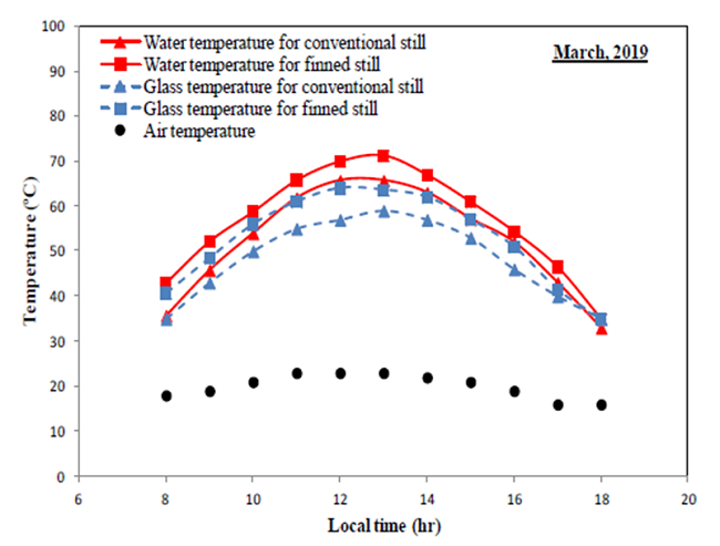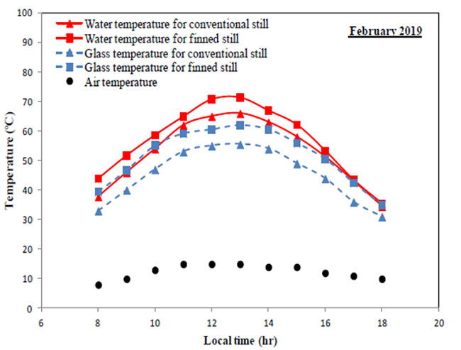 Figure 5 display the hourly alteration of the solar irradiance between February and May. In these figures, the test days were divided into four categories, according to the monthly radiation level. The first is for days with average radiation of approximately 271 W/m2 (February), the second for 382 W/m2 (March), the third for 504 W/m2 (April), and the forth for 650 W/m2 (May). Solar irradiance begins to rise in the morning, attains the maximum value in the afternoon and then commences reduction after 1 p.m. The maximum value recorded was 860 W/m2 for 21 May 2019. The hourly alteration of the solar basin water temperature, glass temperature and ambient air are displayed in Figures 6, 7, 8 and 9 for an average of three test days in each month. These figures illustrate the experimental hourly variations of the water basin, glass and air temperatures in the conventional solar still and finned solar still. The trend of temperatures for all solar stills was found similar. Temperatures of basin water are observed to be the highest followed by glass temperature in order. The temperature rises during the daytime up to the maximum nearly at 1.00 p.m. It was noticed that the lowest measured temperature in the water basin was found in the conventional solar still while the higher temperature was found in the finned basin solar still was used. For two stills, the maximum temperature of the water is during the month of May as the solar intensity is higher.