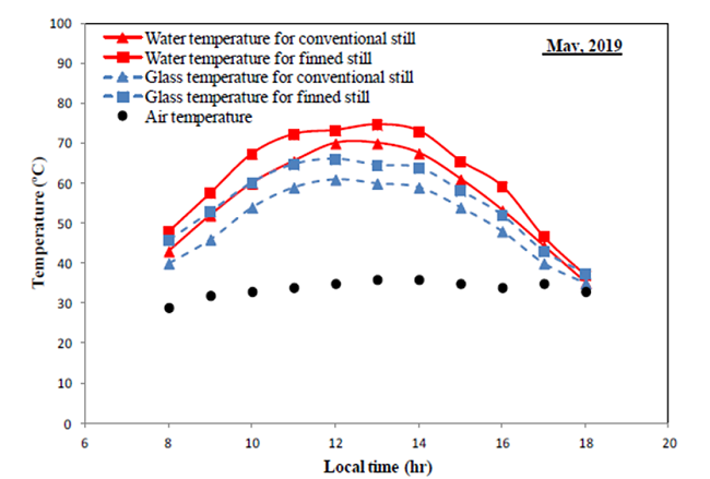 The maximum water temperature in the distillation basin was measured and found to be 70.0 ˚C and 74.6 ˚C for conventional and finned solar stills, respectively during the month of May 2019, as shown in these figures.