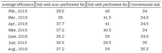 Table 2 shows that the thermal efficiency of the conventional distiller ranged from 34% to 35.5%. In addition, the efficiency of the solar still with finned with non- perforated fin ranged from 36.2% to 38.5% while the efficiency of the solar still with finned with perforated fin ranged from 38% to 43%, depending on the month.