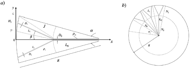 The elemental circular sector is considered to have a slender geometry, with an angle α and known area A0. The area can be approximated as an isosceles triangle A0≈ H0R/2 . We anticipate that this approximation will be helpful to define the total area of the branched elements based on the area A0, disc-size, and number of sectors distributed over the disc-shaped body solar cell. The first element and coordinate system are shown in Figure 1.
