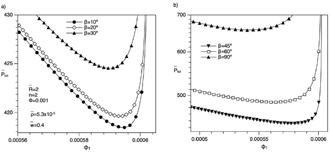 In the following Figures 5 and 6, the influence of the number n of branched contacts is shown, for a fixed value of β = 10 degrees and maintaining the same values of the dimensionless parameters used previously. The power losses for an n -branched arrangement present a minimum value with respect to the allocation of the metallic contact, given by ϕ1. As the number n of branches increases, the minimum value of the power losses increases, due to the presence of branched metallic contacts and occurs at a lower value of the geometric parameter ϕ1.