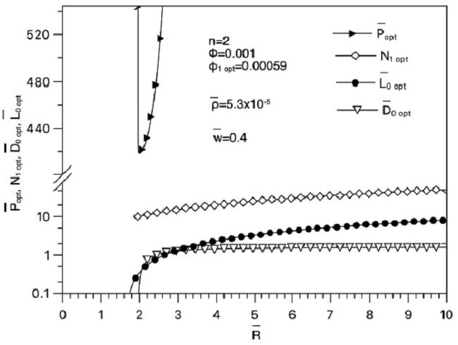 In order to analyze the influence of the disc size, given by on the main characteristics of the bifurcated metallic contacts arrangement, we take fixed the value of for an angle β = 0 degrees, where a minimum value of is presented. With this value of ϕ1 opt an optimal configuration of the metallic contacts network is defined, due to that ϕ1 indicates how the metallic material of the contact is allocated over the circular constructal element. In Figure 4, keeping fixed the values of the dimensionless parameters used previously, the dimensionless power loss and geometric characteristics of the branched arrangement as the number of sectors, width ratio and dimensionless length with respect to are shown.