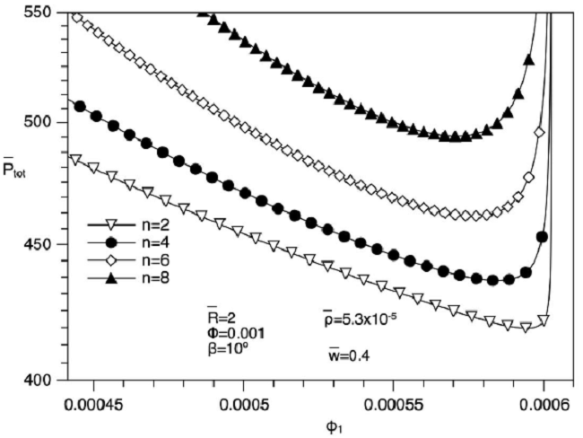 Meanwhile, in Figure 6, we use the corresponding optimal value of the geometrical parameter ϕ1 opt where the minimum power loss is presented, for every n -branched value given in Figure 5, to reveal the influence on the power losses of the 𝑛-branched contact arrangement and the width ratio with respect the disc size