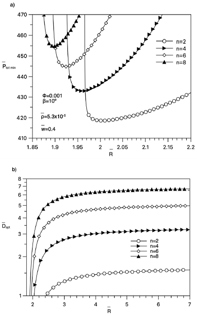 In Figure 6a) the total power losses present a minimum values for an n -branched arrangement of the metallic contacts, for the bifurcated case, n = 2 , the minimum is presented at in comparison to n = 8 where the minimum value of the power loss is presented at . The minimum value of the power losses for the branched case is less than the geometric arrangement with eight branches i.e. For a value of n > 2 , the minimum value of the power losses occurs at a lower value of the disc size, given by
