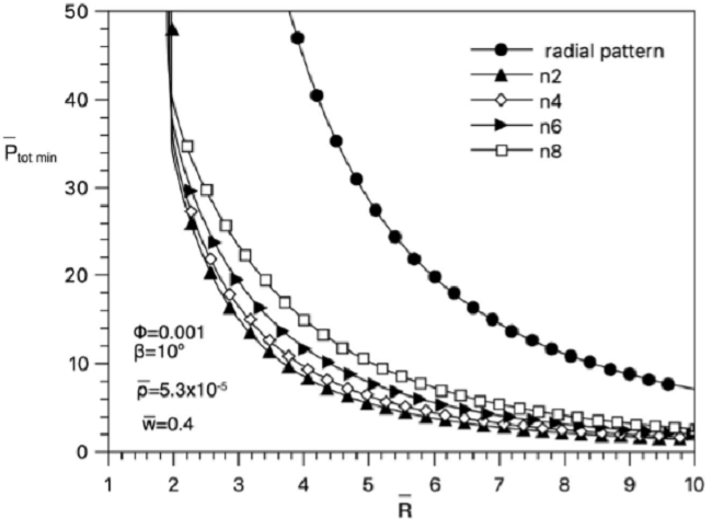 The minimum total power losses of the geometrical arrangement with respect to the entire disc area is shown in Figure 7. The previous results were obtained with total power losses, given by Eq.(25). For this purpose, we rewrite Eq.(25) in terms of the area of the disc A = πR2 in order to describe the behavior of the power loss with respect to the disc size, considering the optimal value of ϕ1 opt for every 𝑛-value of branching and a fixed value ϕ0=0.0001 for the radial pattern. As the disc size increases, the total power loss of the branched arrangement tends to decrease asymptotically to a value close to .