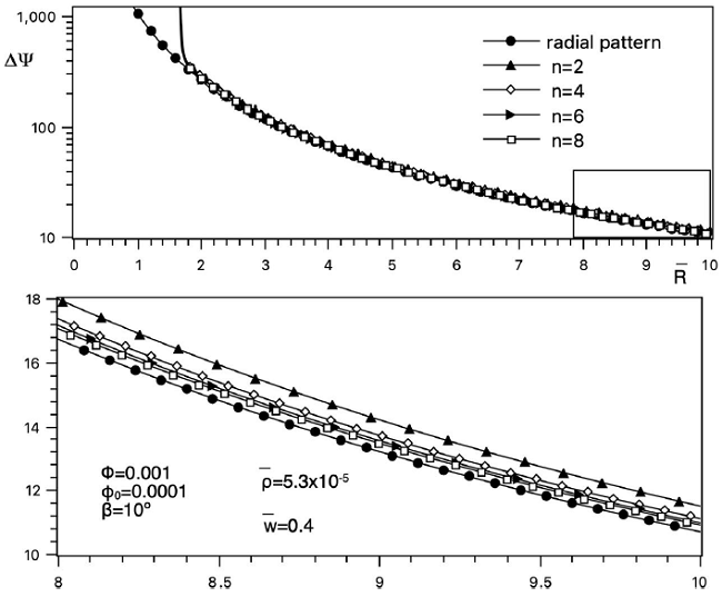 The dimensionless electric resistance Δψ presents a divergent value at due to the definition of the aspect ratio of the central sector of a branched configuration. For large values of , the dimensionless resistance presents an asymptotic behavior and tends to a value close to Δψ ≈11.0 . For values n > 2 , the dimensionless electric resistance presents the lowest values compared to the bifurcated case but increases the resistive losses. The equivalent resistance of the geometric arrangement of the contacts can be considered as a series resistance. This resistance is desirable to be minimal to improve the collection of electrical current generated.