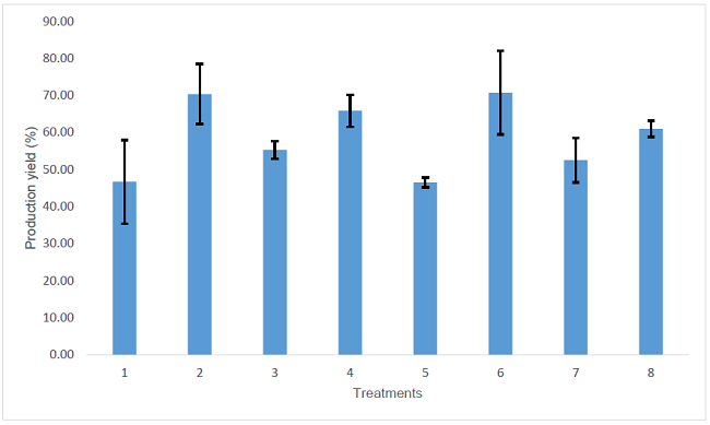 The highest yields concerning the production of activated carbon, and using H3PO4, were achieved with treatments 2 and 6, with yields of 70.3% and 70.7% respectively; while using ZnCl2 as activating agent, the highest yields were achieved with treatments 3 and 7, with corresponding yields of 55.3% and 52.5% respectively. Average production performance and standard deviation results are shown in Figure 1: