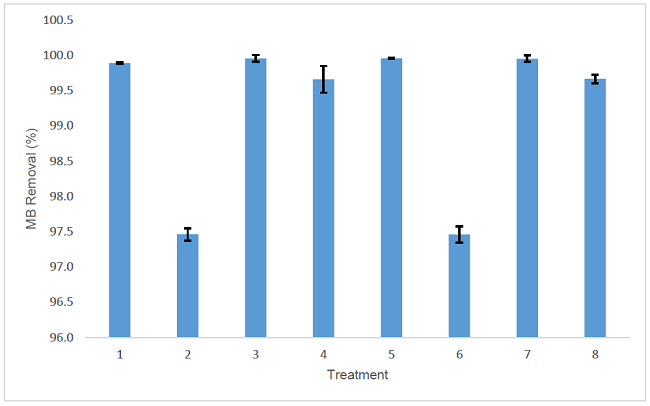 To determine if there is a statistical difference concerning the adsorption of methylene blue between the different factors and their interrelationships, a 23 factorial statistical design, with triplicates, was proposed for each of the different activated carbon treatments shown in Table 1. The removal percentage of methylene blue was chosen as the response variable. The following equation was obtained for the model: