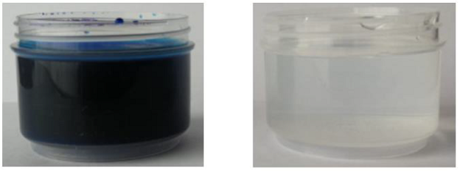 Figure 3a shows the methylene blue solution with a concentration of 400 ppm and Figure 3b shows the adsorption effect of the activated carbon produced by treatment 3 (ZnCl2, a ratio of 4:1 and without drying prior to carbonization).