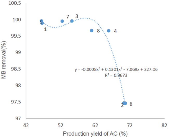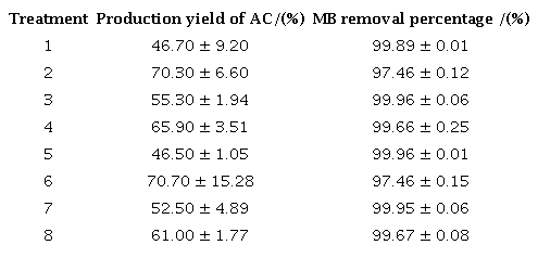 Table 2 presents a summary of the average percentages for production yield of activated carbon and methylene blue removal for each of the treatments performed.