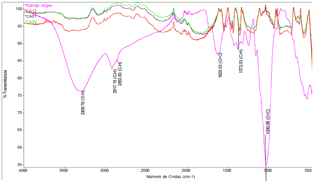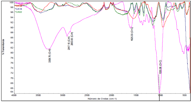 In Figure 5, the spectrum of raw pineapple stubble (purple-fuchsia color) is displayed, without any treatment. The other spectra correspond to the triplicates of treatment 1 (ZnCl2 as activating agent, impregnation ratio of 2:1, and no drying prior to carbonization). It was observed that there is a notorious peak at 3309 cm-1 for pineapple stubble, which corresponds to an O-H hydroxyl group. Close to that peak, another one can be seen, at 2917.15 cm-1, which corresponds to a vibration of the C-H bond. It is noted that the spectrum of the produced activated carbons do not contain these peaks, indicating that the hydrogen present in the lignocellulosic matrix of the stubble is eliminated during activation and carbonization processes, a situation that was also observed in the research of Mahamad et al. (2015).