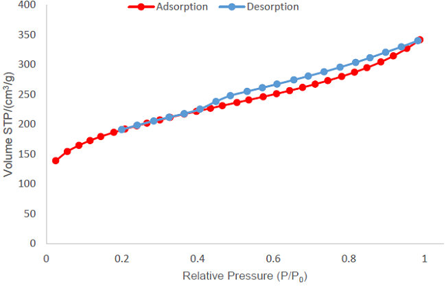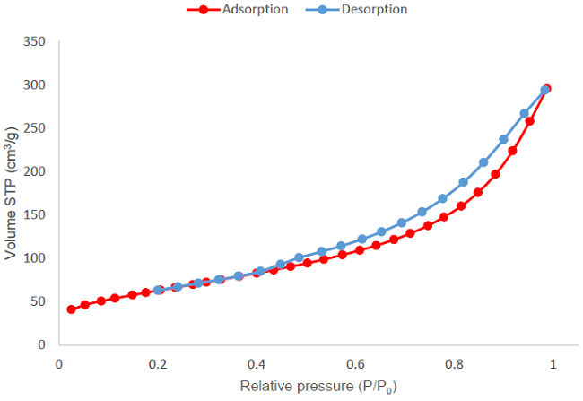 Figure 7 shows the nitrogen adsorption isotherm obtained for the activated carbon produced by treatment 4 (H3PO4, a ratio of 4:1 and without drying). The red-colored curve represents adsorption, while the blue-colored curve, desorption. This isotherm tends to a type IV isotherm with a type H3 hysteresis cycle, according to the examples presented by IUPAC. This isotherm is characteristic of activated carbons with mesopores of disordered structure (Thommes et al., 2015).