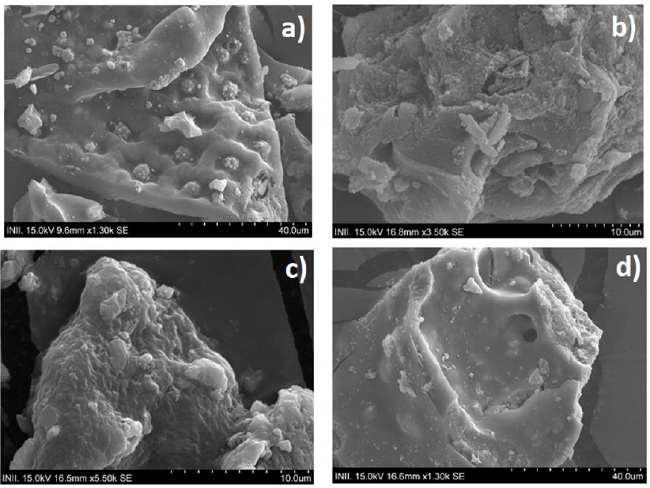 Activated carbon shown in Figure 9(c) corresponds to the same treatment as that shown in (a), but after the adsorption process of methylene blue. There is a clear difference in the surface observed for this activated carbon in comparison with the observed for the same activated carbon without adsorption. A uniform layer that covers the carbonaceous structure after adsorption can now be seen. Also, pores are not as clearly distinguished as in Figure 9(a). These results are similar to those reported by Mahamad et al. (2015) for the SEM analysis of activated carbon after adsorption of methylene blue. And suggest that methylene blue sticks to the surface of the activated carbon, thus saturating the pores.