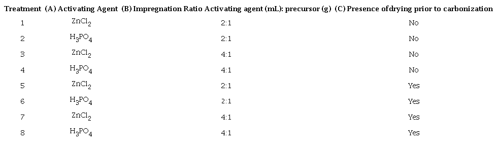 From the significance of the AB interaction between the activating agent and the impregnation ratio used, it is possible to conclude that the activated carbon that provides higher adsorption under the studied conditions corresponds to the activated carbon produced using zinc chloride as activating agent at an impregnation ratio of 4:1 (treatments 3 and 7).