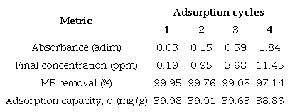 After three cycles, a final concentration of methylene blue of 3.68 ppm was obtained. It is below the value used as a reference which corresponds to the limit allowed by the legislation for active substances to methylene blue (5 ppm) in Costa Rica. After the fourth cycle, a concentration of 11.45 ppm was obtained, which exceeds the reference value of 5 ppm. It was observed a decrease in the adsorption capacity of activated carbon from 39.98 mg/g to 38.86 mg/g after 4 cycles of use without regeneration.
