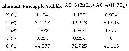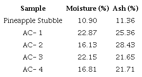 Table 4 displays the moisture and ash results obtained for pineapple stubble and activated carbon (treatments 1 to 4) which are the treatments produced without drying prior to carbonization.