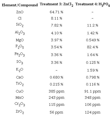 Regarding activated carbon produced through treatment 4, it is observed that the predominant oxide is P2O5 (82.4%) followed by SiO2 (11.2%). Since this activated carbon was produced using H3PO4, it was expected phosphorus, in its P2O5, to be the main component detected. Such high amount of P2O5 on the surface of the activated carbon could affect adsorption, resulting in a lower adsorption performance when compared to activated carbons produced using ZnCl2. The research by Zbair et al. (2018) indicated that activated carbons with high phosphorus (P) content achieved lower adsorption yields of methylene blue than activated carbons with lower P content.