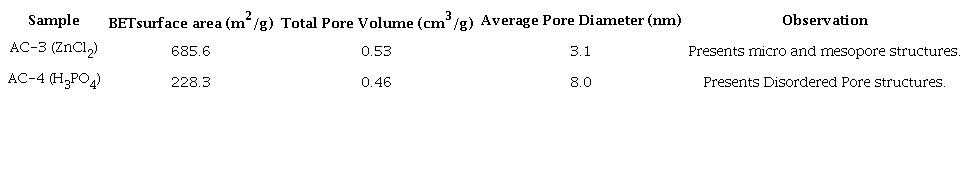 Therefore, according to the results obtained in this analysis and in agreement with Donald et al. (2011), it can be indicated that zinc chloride is more effective in the development of meso and microporous structures, which promote higher surface areas. Phosphoric acid, on the other hand, is more effective in the development of mesopores (disordered and heterogeneous), which lead to larger average pore diameters.