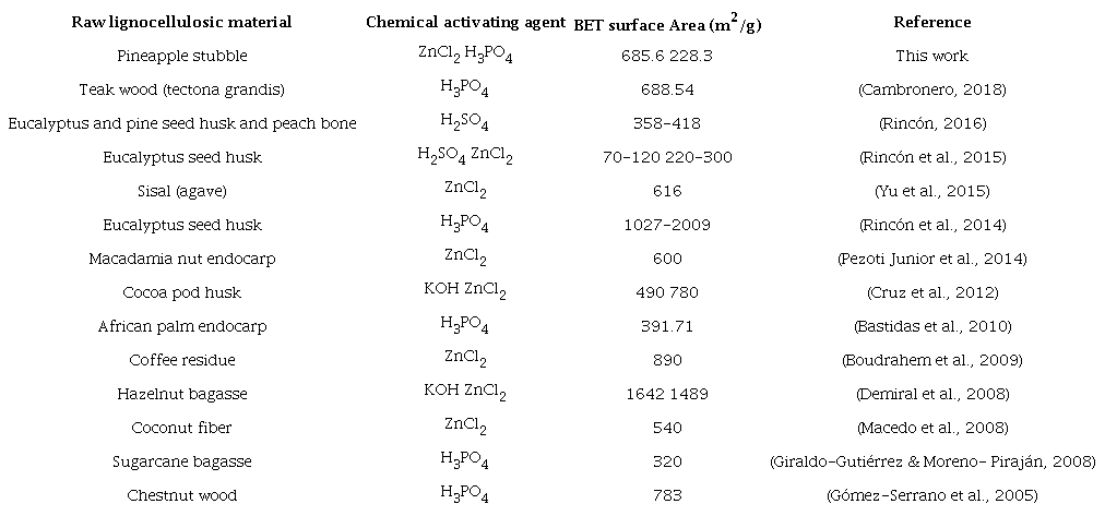 The difference between the surface areas for each activated carbon produced using the activating agents H3PO4 and ZnCl2 is related to the different activation mechanisms. It has been proposed that the activation of phosphoric acid is carried out through the formation of cross-linked structures in the form of phosphate esters, which are directly related to the development of porosity (Jagtoyen & Derbyshire, 1998). At a temperature of 600 °C occurs a breakdown of these cross-linked structures, causing contraction and reduction in the porosity development (Donald et al., 2011). In contrast, the activation mechanism of zinc chloride is believed to be more related to the "swelling" effect of the lignocellulosic matrix of pineapple stubble caused by ZnCl2. This results in a breakdown of the lateral bonds of the molecules of cellulose and consequent creation of interspaces, allowing easier access of the activating agent to the interior of the biomass structure (Donald et al., 2011). In other words, the activating agent acts as a template for the subsequent formation of microporosity, later obtained through the activated carbon washing, in which remnants of zinc chloride are eliminated, thus creating microporosity (Molina-Sabio & Rodríguez-Reinoso, 2004).