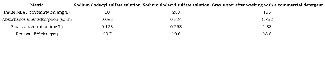 Activated carbon proved to be effective in the adsorption of sodium dodecyl sulfate solutions. For both scenarios, a removal efficiency higher than 98 % was achieved. Similar results were obtained in the adsorption of gray water: a final concentration of 1.88 mg/L of methylene blue active substances was achieved, a value that is also below the allowed limit (5 mg/L) (MINAE, 2007). A removal percentage of 98.6 % was obtained, thus indicating effective adsorption of the anionic surfactants present in the residual gray water.